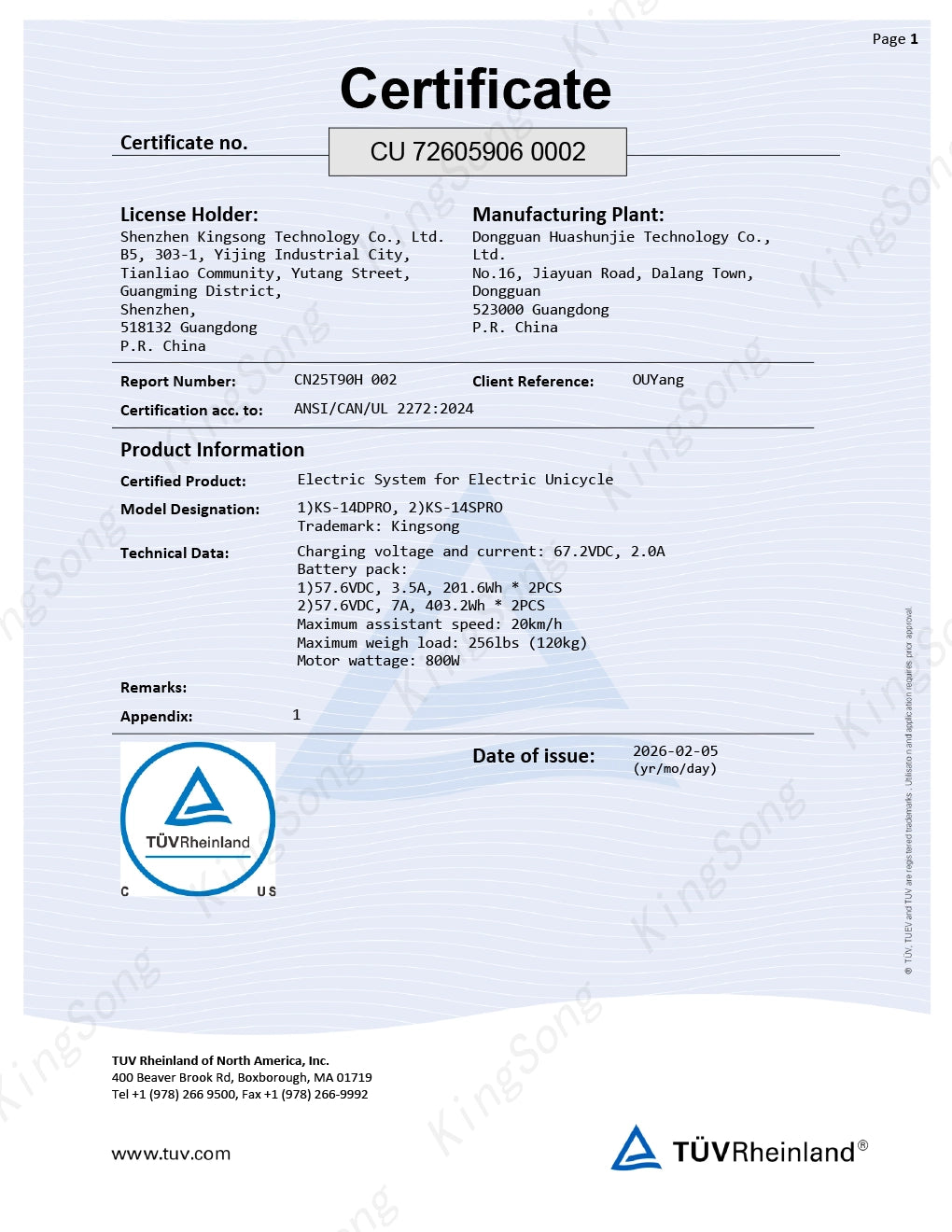 KingSong 14D Pro/2000W Motor/800W Rated Power/420wh battery capacity/UL 2272 Certified