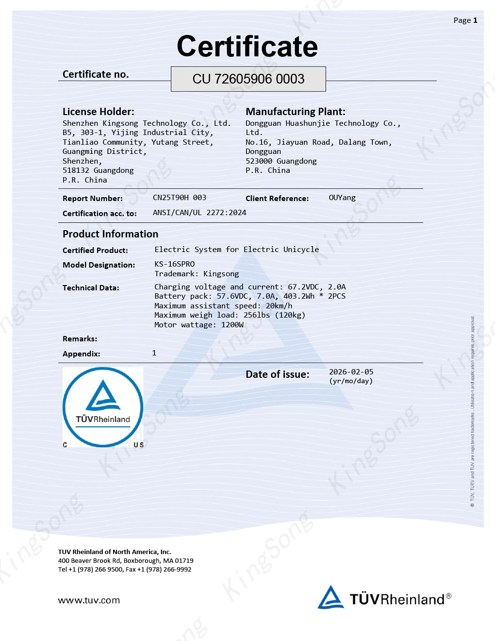 KingSong 14D Pro/2000W Motor/800W Rated Power/420wh battery capacity/UL 2272 Certified