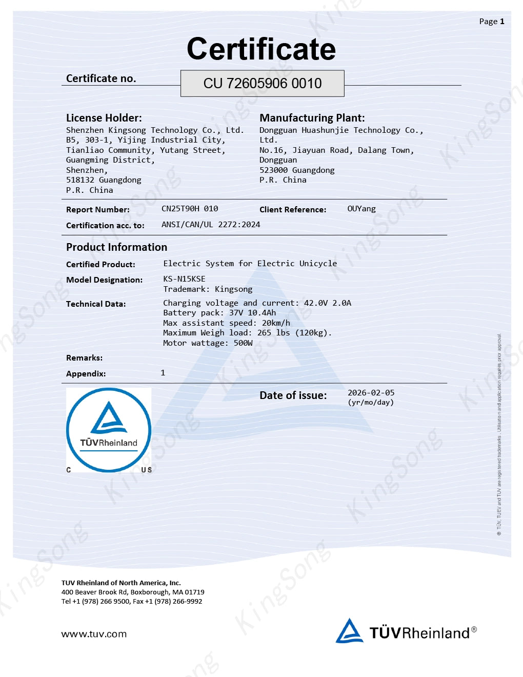 KingSong N15 Series Electric Scooter, 10inch, 60Km Range, 697.45Wh Battery, Rated 500W(900W Peak), UL 2272 Certified